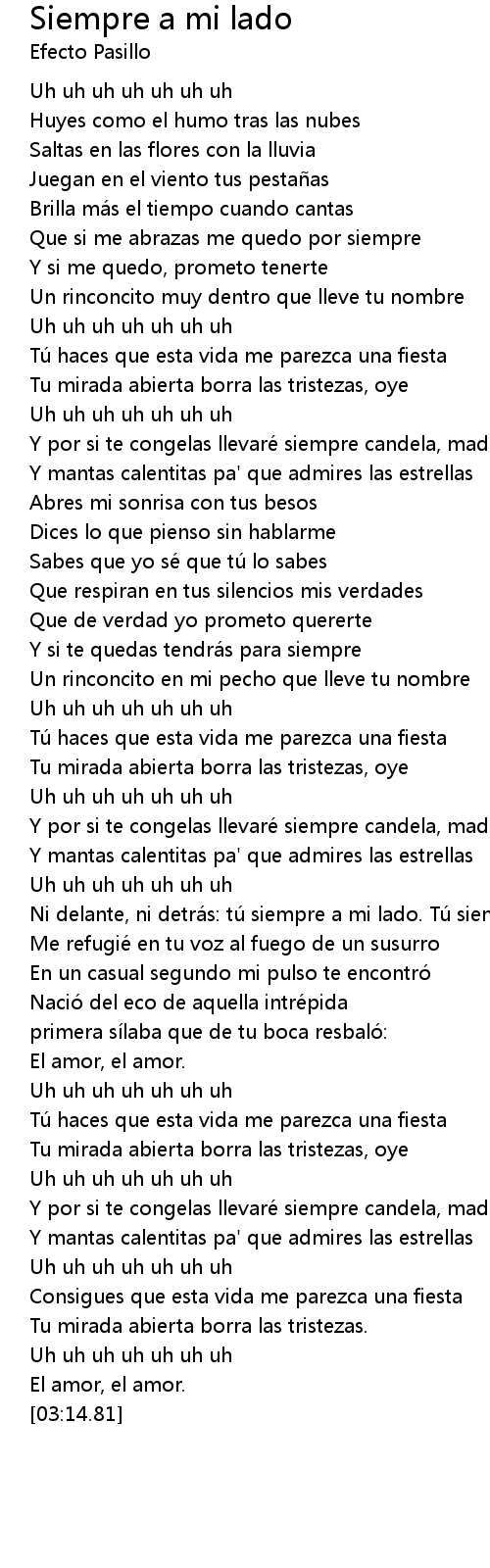 | [02:03.43] | Ni delante, ni detra s: tu siempre a mi lado. Tu siempre a mi lado |