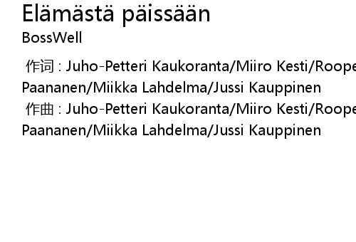 | [00:00.00-1] | zuò cí : JuhoPetteri Kaukoranta Miiro Kesti Roope Hietala Miska Paananen Miikka Lahdelma Jussi Kauppinen |