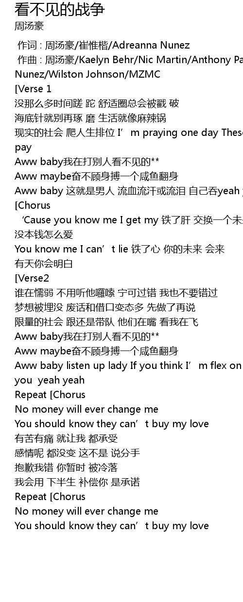 | [00:01.000] | zuò qǔ : zhōu tāng háo Kaelyn Behr Nic Martin Anthony Pavel Adreanna Nunez Wilston Johnson MZMC |