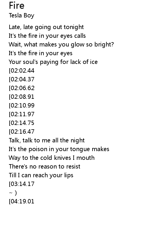 | [01:15.58][02:14.75][03:47.95] | There's only fire in your eyes |