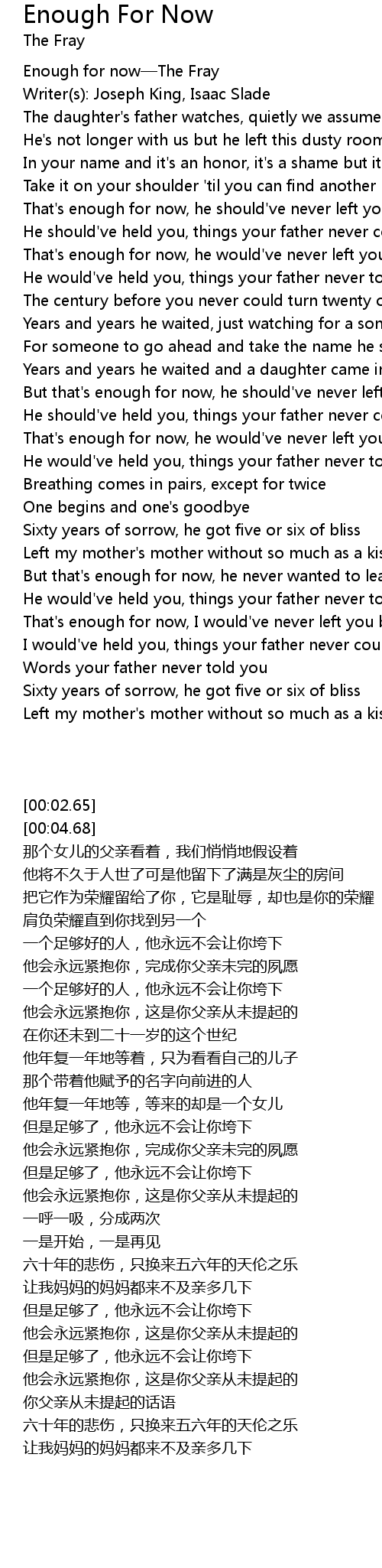 | [00:02.65] | Enough for now The Fray |