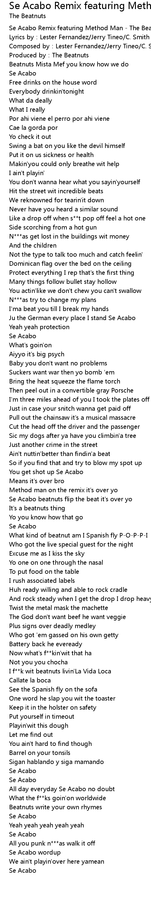 | [00:00.10] | Se Acabo Remix featuring Method Man - The Beatnuts |