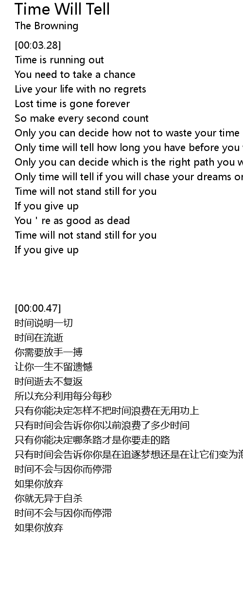 | [01:09.00] | Only time will tell if you will chase your dreams or let them die |
