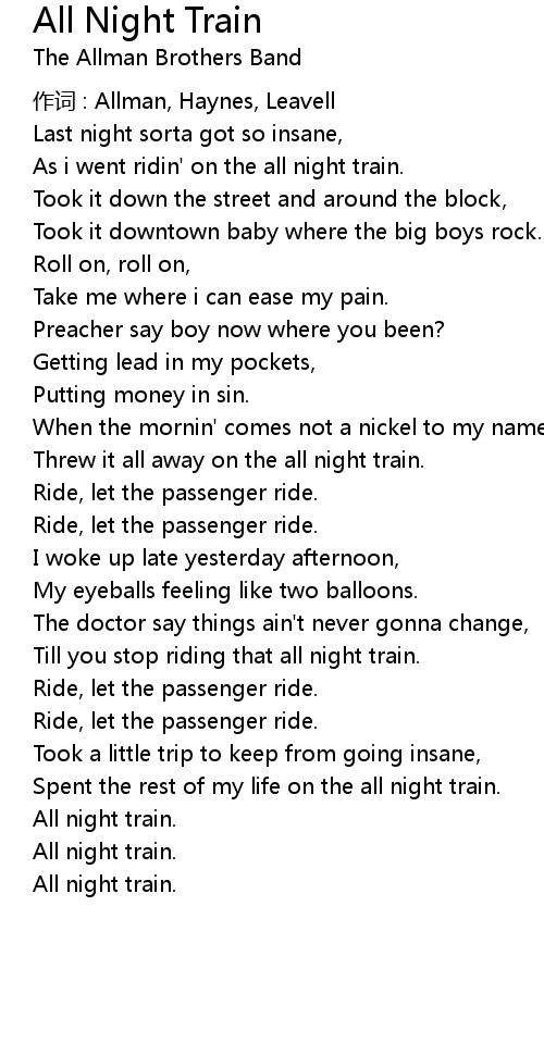 | Till you stop riding that all night train. | |