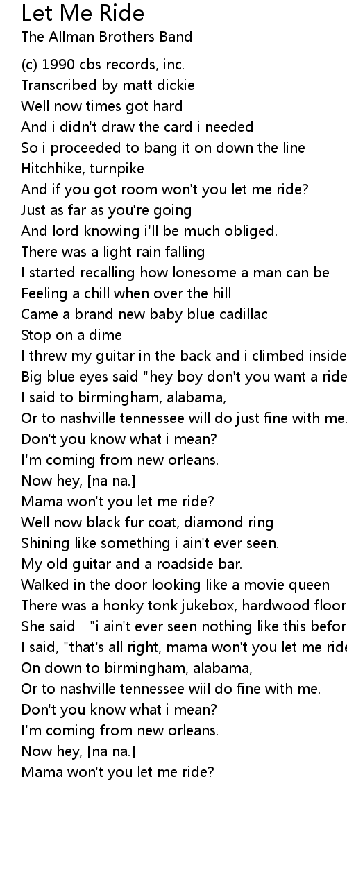 | And if you got room won' t you let me ride? | |