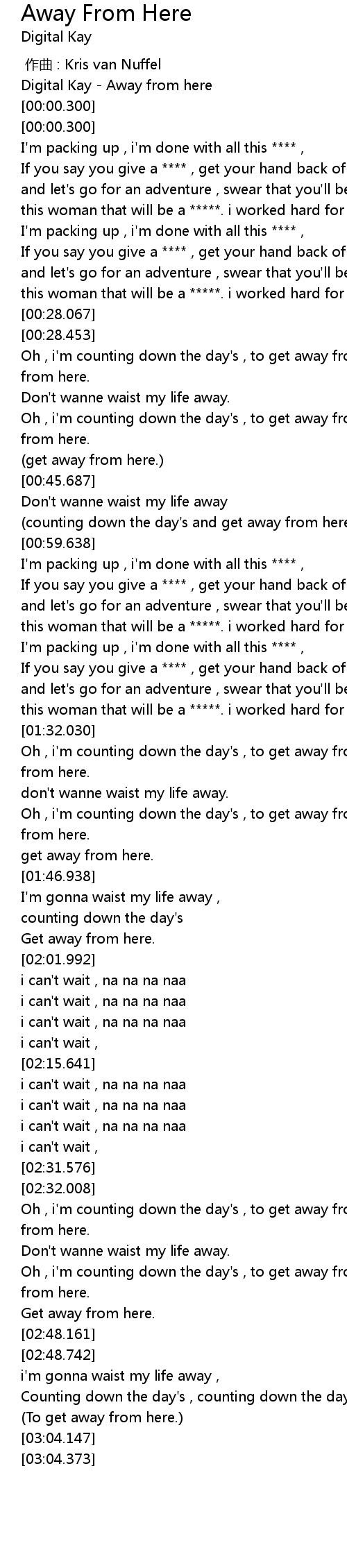 | [02:41.872] | Oh , i' m counting down the day' s , to get away from here, to get away from here. |