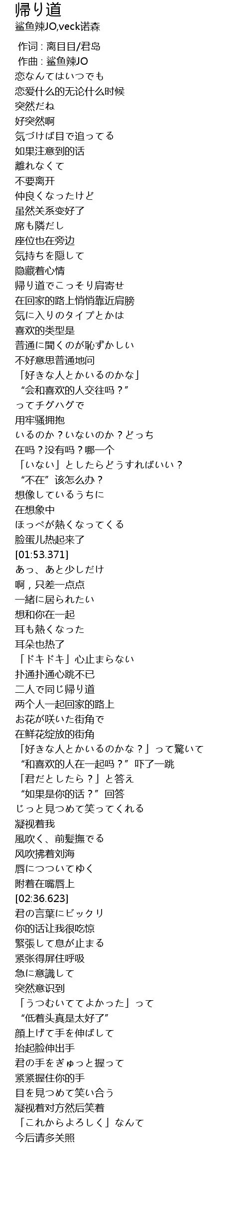 | [01:00.869] | 在回家的路上悄悄靠近肩膀 |