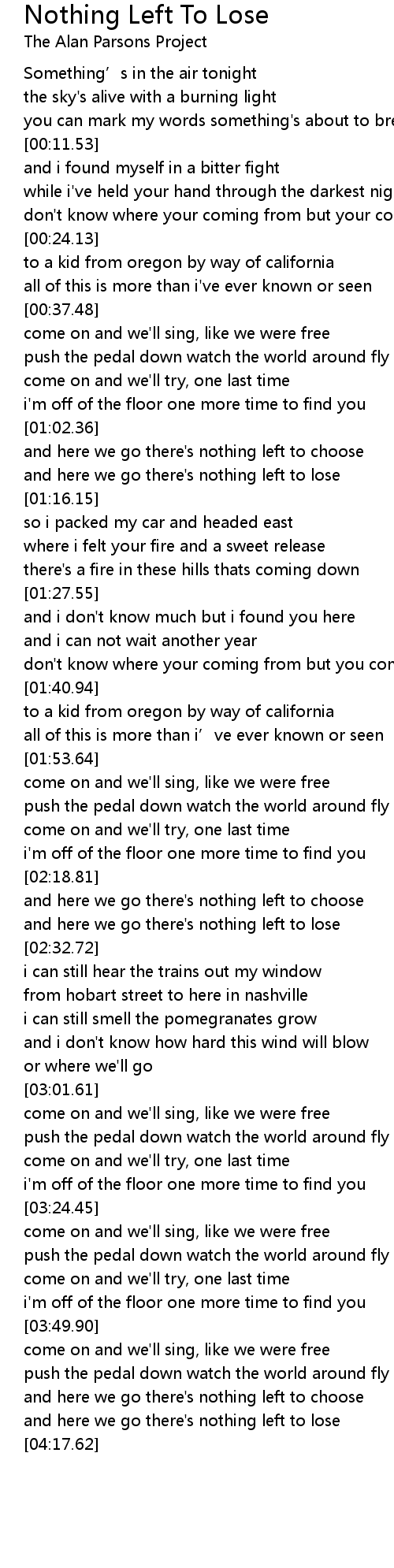 | [04:09.55] | and here we go there' s nothing left to lose |