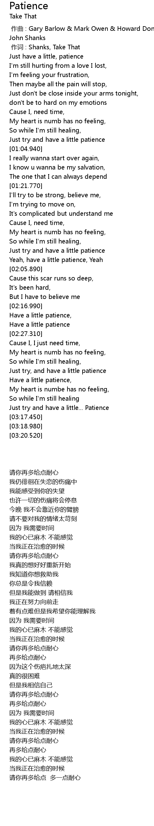 | [00:01.00] | 作词 : Shanks, Take That |