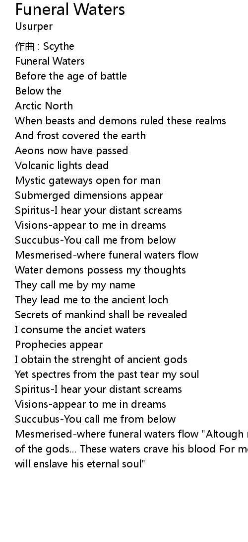 | Mesmerisedwhere funeral waters flow " Altough mortal man shall obtain the powers of the gods... These waters crave his blood For momentary immortality... Man will enslave his eternal soul" |