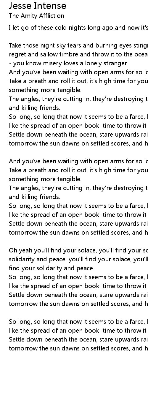 Take those night sky tears and burning eyes stinging from pursuit; take your regret and sallow timbre and throw it to the ocean where misery can seek it out - you know misery loves a lonely stranger. |