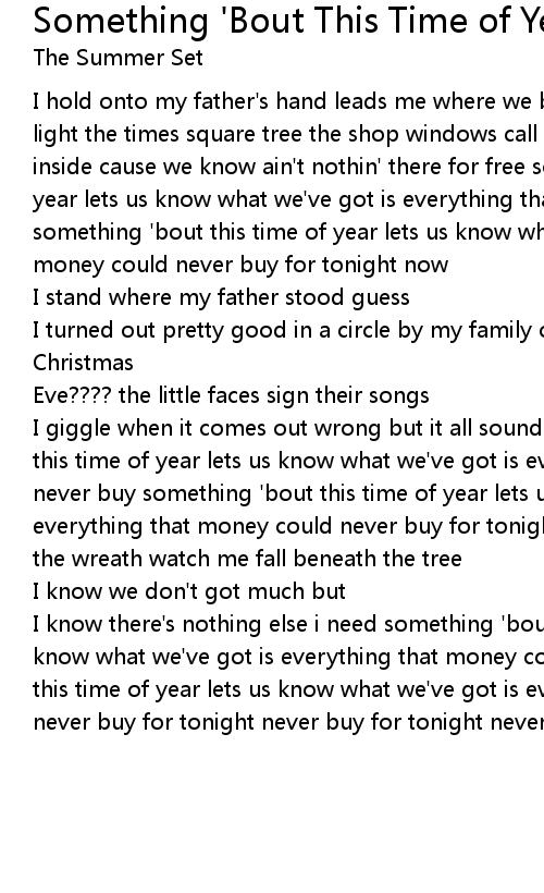 I giggle when it comes out wrong but it all sounds perfect to me something 'bout this time of year lets us know what we've got is everything that money could never buy something 'bout this time of year lets us know what we've got is everything that money could never buy for tonight there's never anything before the wreath watch me fall beneath the tree