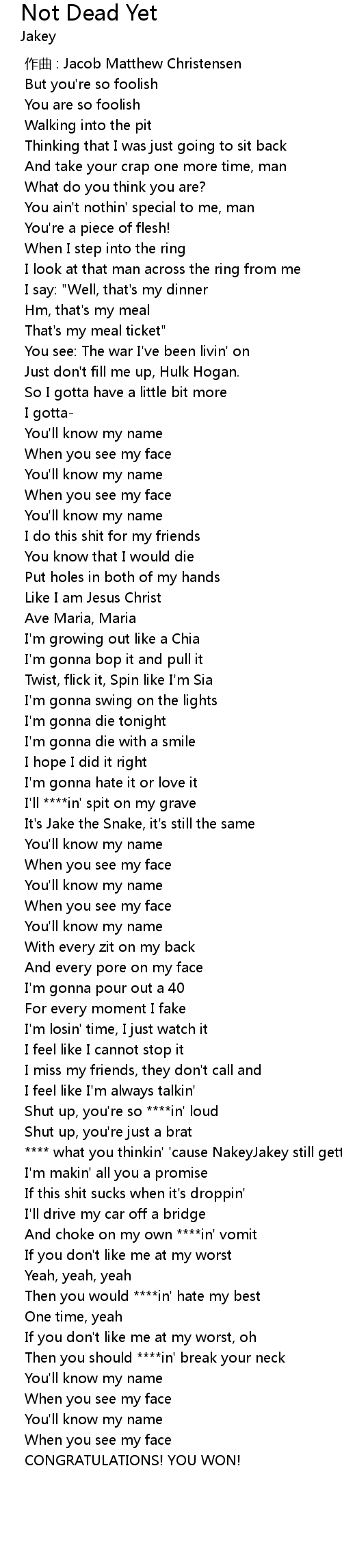 | [01:29.168] | It' s Jake the Snake, it' s still the same |