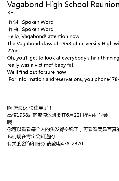 | [00:01.200] | The Vagabond class of 1958 of university High will holda reunion June 22nd. |