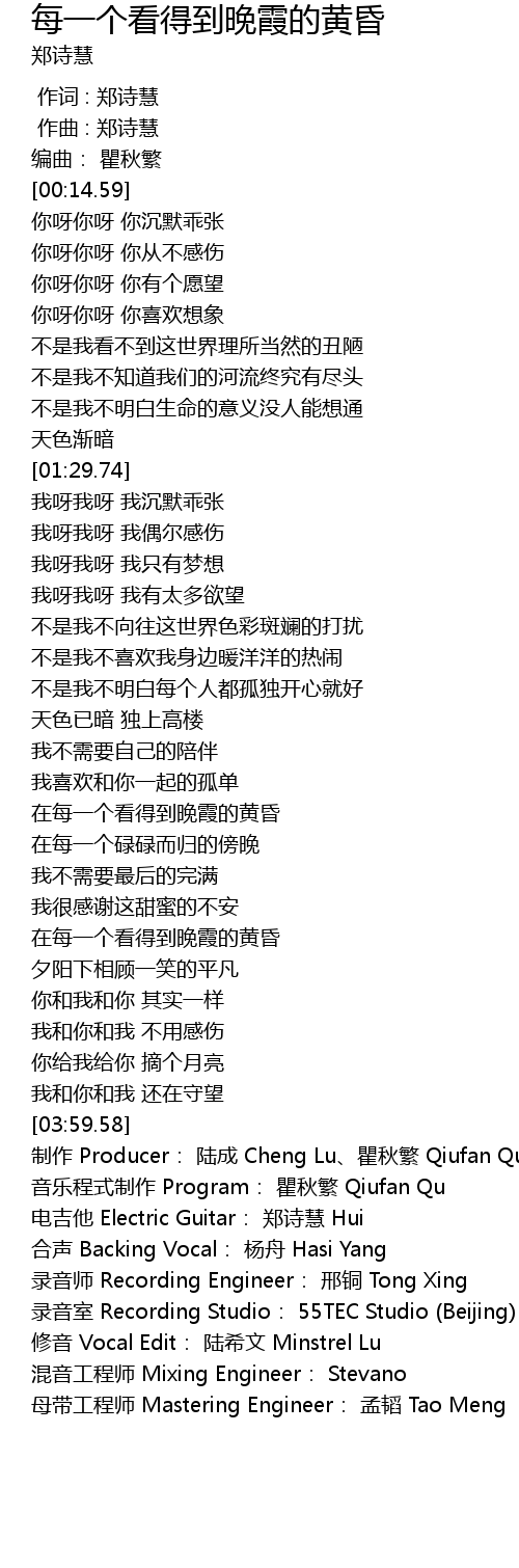 | [03:59.93] | zhì zuò Producer: lù chéng Cheng Lu qú qiū fán Qiufan Qu |
