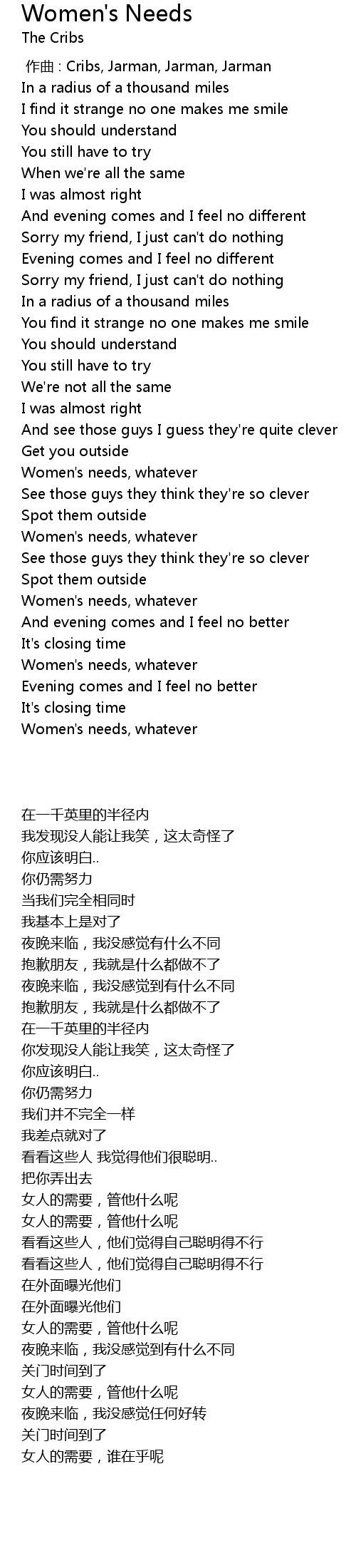 | [01:58.81] | Women' s needs, whatever |