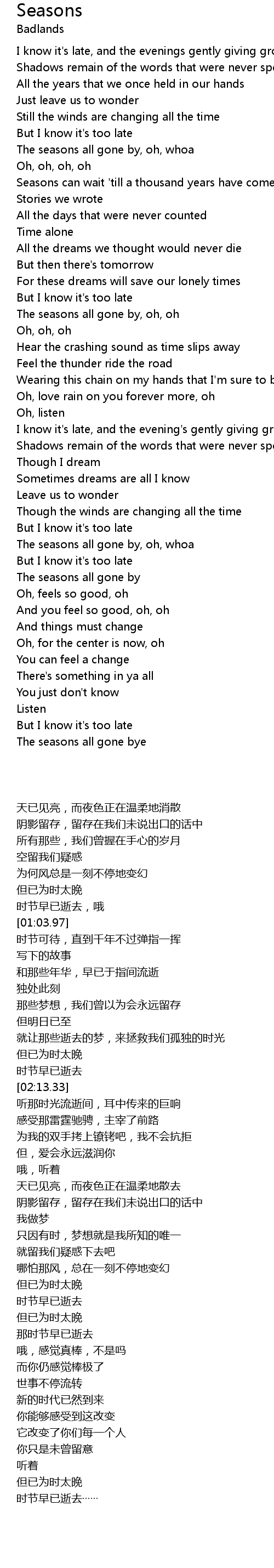 | [01:23.99] | Seasons can wait 'till a thousand years have come and gone |