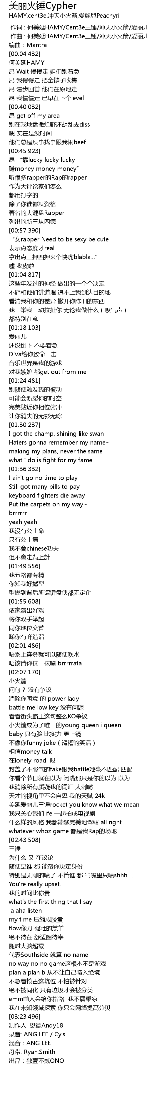 | [00:00.000] | 作词 : 何美延HAMY/Cent3e三锤/冲天小火箭/爱丽儿 |