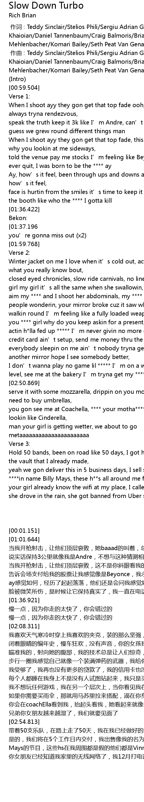 | [02:13.032] | closed eyed chronicles, slow ride carnivals, no lines audible, your girl my girl it’s all the same when she swallowin, |