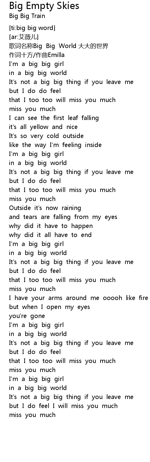 | [00:01.449] | 歌词名称Big Big World 大大的世界 |