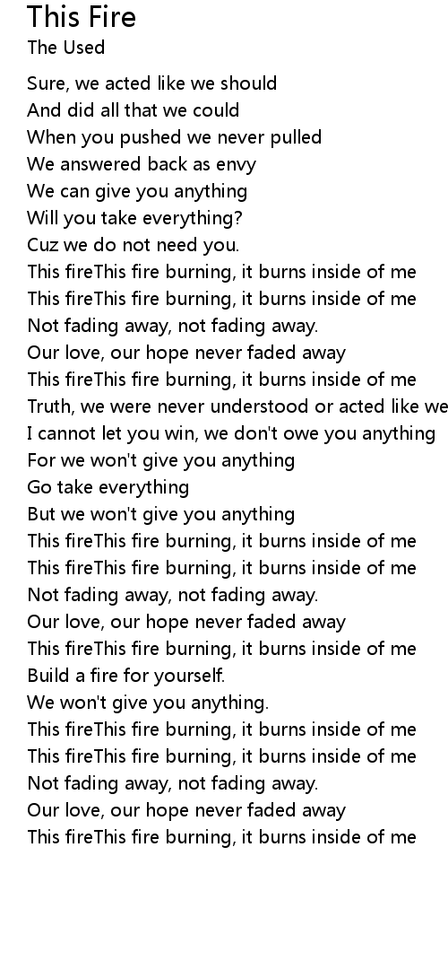 | This fireThis fire burning, it burns inside of me |