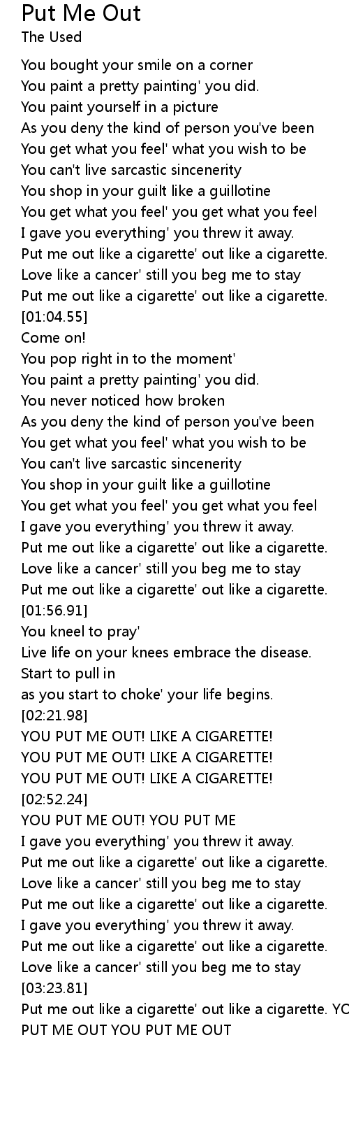 Put me out like a cigarette' out like a cigarette. YOU PUT ME OUT YOU PUT ME OUT YOU PUT ME OUT |