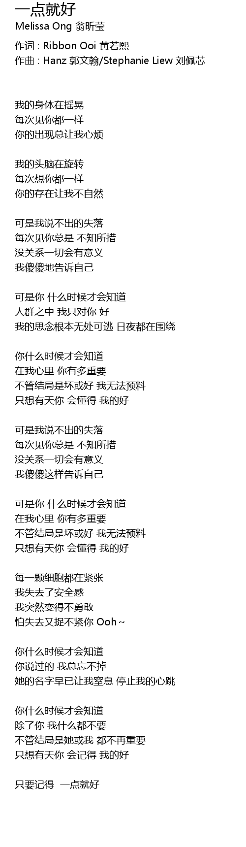 | 作词 : Ribbon Ooi 黄若熙 | |