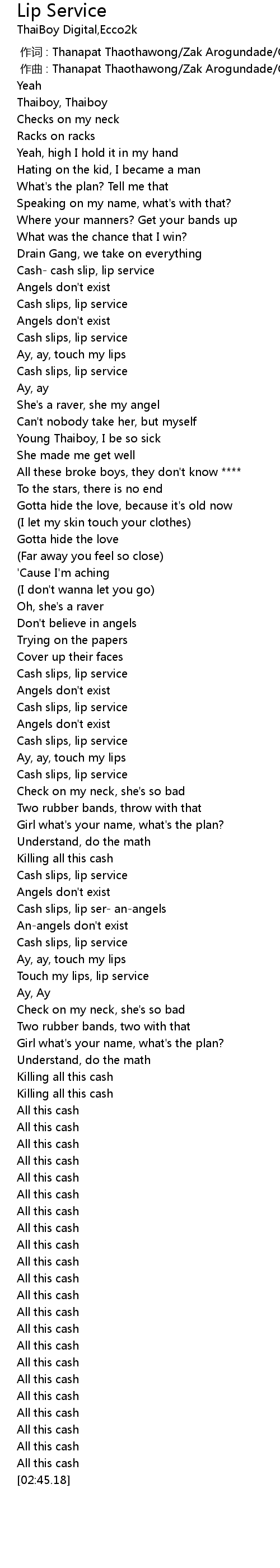 | [01:40.94] | Cash slips, lip service |
