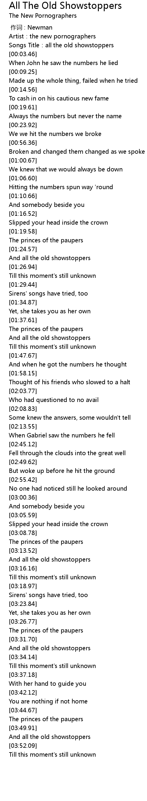 | [00:01.71] | Songs Title: all the old showstoppers |