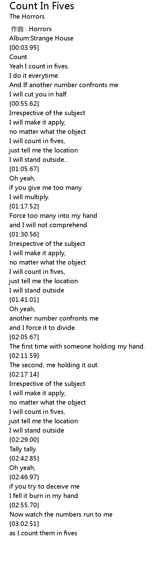 | [00:34.03] | Yeah I count in fives. |
