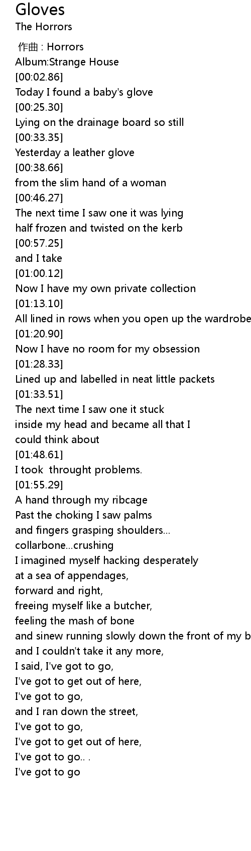 | [00:21.52] | Today I found a baby's glove |
