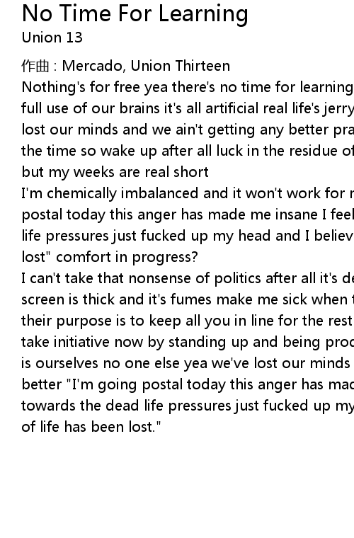 | Nothing' s for free yea there' s no time for learning to regain our strength or full use of our brains it' s all artificial real life' s jerry springer yeah we lost our minds and we ain' t getting any better prayers don' t get answered all the time so wake up after all luck in the residue of design my days are all long but my weeks are real short | |