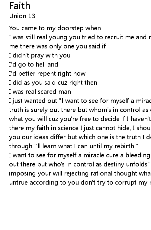 I just wanted out "I want to see for myself a miracle cure a bleeding statue the truth is surely out there but whom's in control as destiny unfolds, believe in what you will cuz you're free to decide if I haven't felt it probably isn't there my faith in science I just cannot hide, I should exist and then so should you our ideas differ but which one is the truth I don't need another to lead me through I'll learn what I can until my rebirth " |