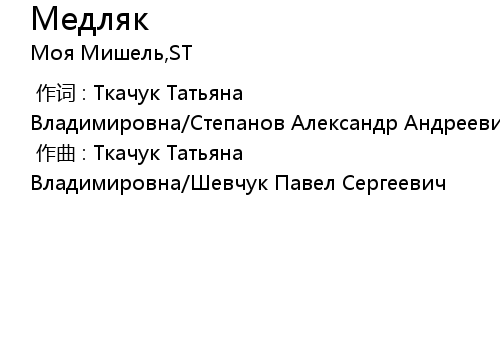 | [00:00.00-1] | 作曲 : Ткачук Татьяна Владимировна/Шевчук Павел Сергеевич |