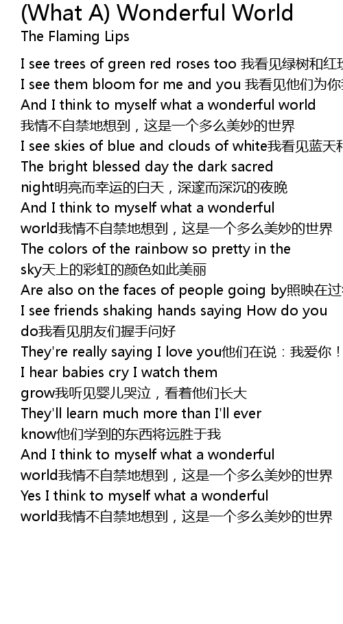 | [00:20.88] | And I think to myself what a wonderful world wo qing bu zi jin di xiang dao, zhe shi yi ge duo me mei miao de shi jie |