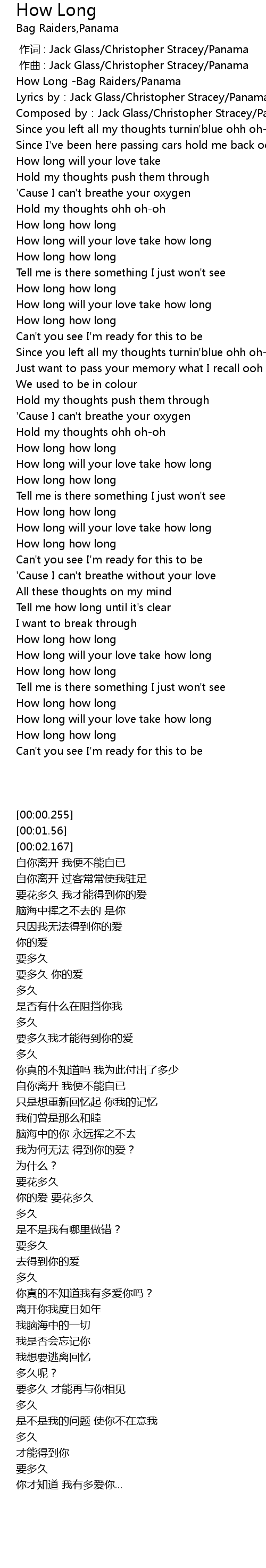 | [00:00.255] | How Long -Bag Raiders/Panama |