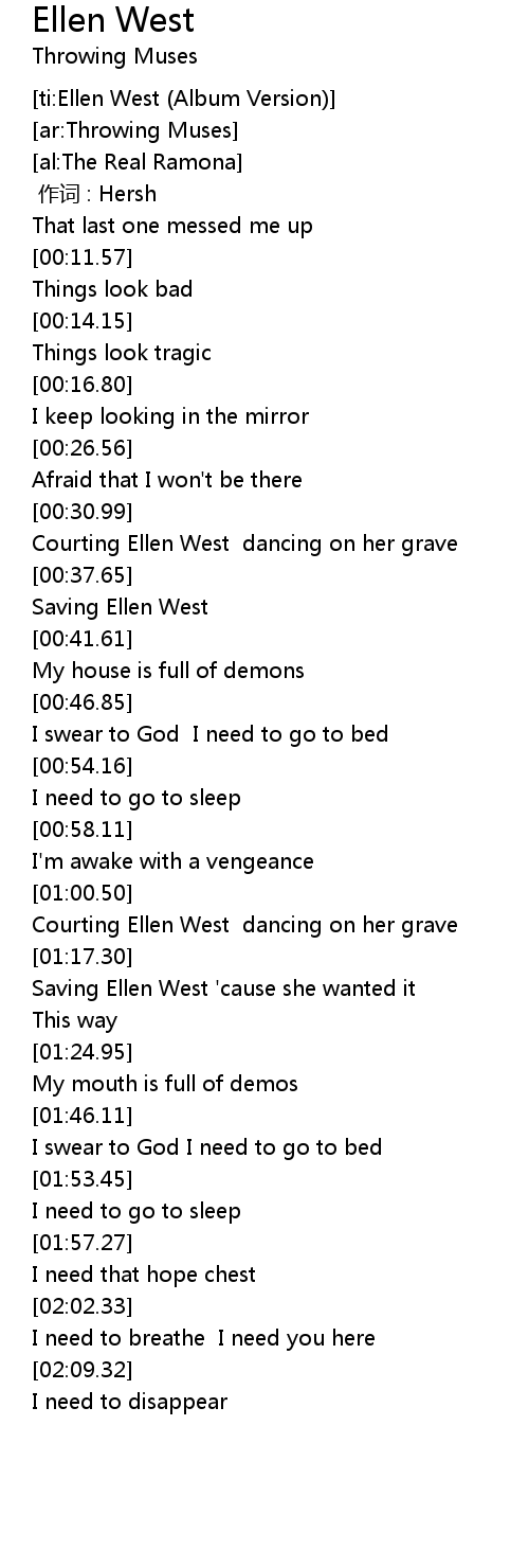 | [00:32.56] | Courting Ellen West dancing on her grave |
