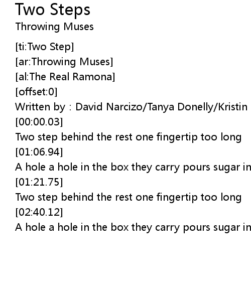 | [00:00.02] | Written by: David Narcizo Tanya Donelly Kristin Hersh Fred Abong |