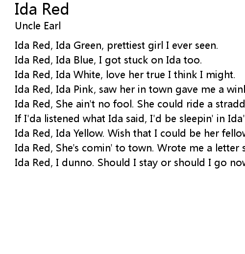 | Ida Red, She' s comin' to town. Wrote me a letter she' s comin' down. | |