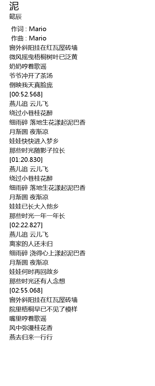 | [02:03.322] | 细雨碎 落地生花漾起泥巴香 |
