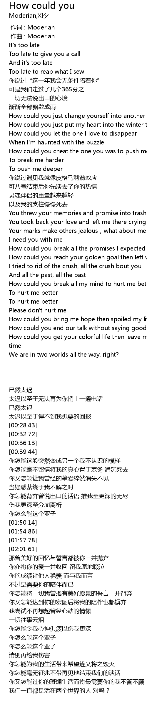 | [03:26.30] | How could you get your colorful life then leave me in my most need-you time |