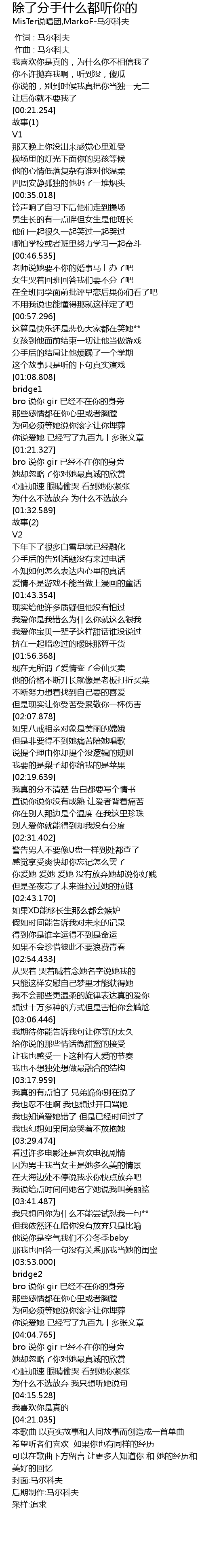 | [02:21.143] | wǒ zhēn de fēn bù qīng chǔ gào bái dōu yào xiě gè qíng shū |