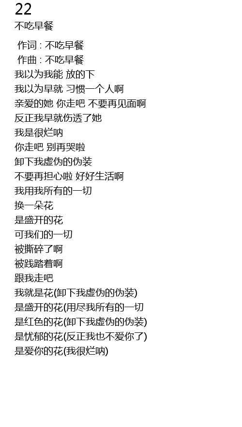 | [00:01.000] | 作曲 : 不吃早餐 |
