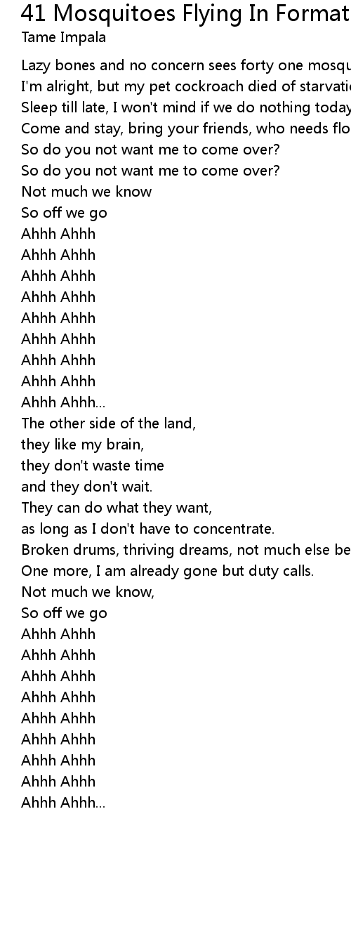 Lazy bones and no concern sees forty one mosquitoes flying in formation, |