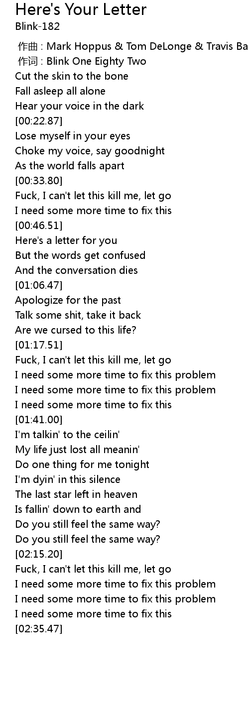 | [00:01.00] | 作词 : Blink One Eighty Two |
