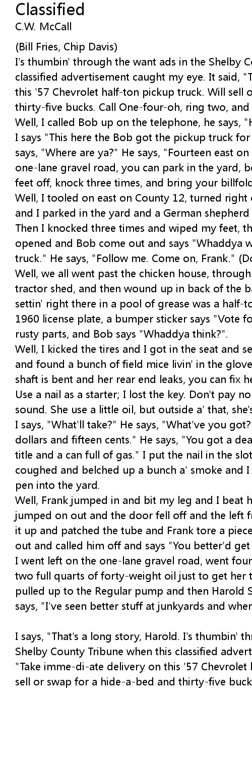 I says, "That's a long story, Harold. I's thumbin' through the want ads in the Shelby County Tribune when this classified advertisement caught my eye. It said, "Take imme-di-ate delivery on this '57 Chevrolet half-ton pickup truck. Will sell or swap for a hide-a-bed and thirty-five bucks..." |