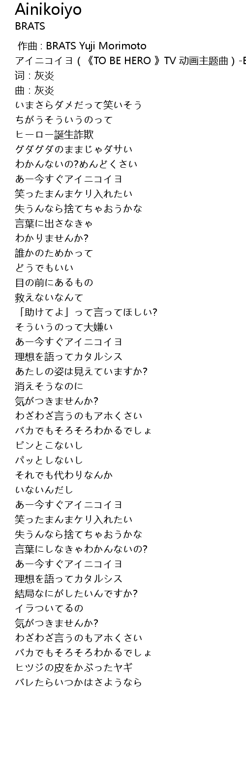 | [00:00.496] | アイニコイヨ(《TO BE HERO 》TV 动画主题曲)-BRATS |