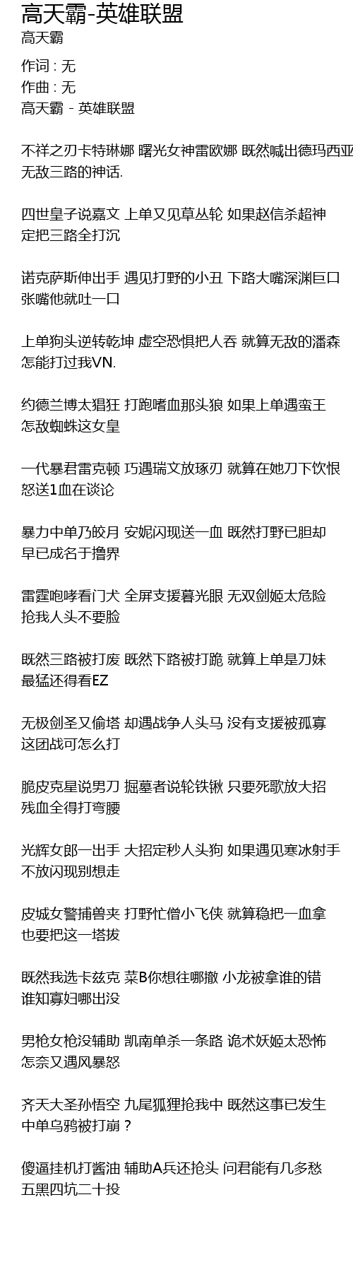 | 诺克萨斯伸出手 遇见打野的小丑 下路大嘴深渊巨口 张嘴他就吐一口 | |