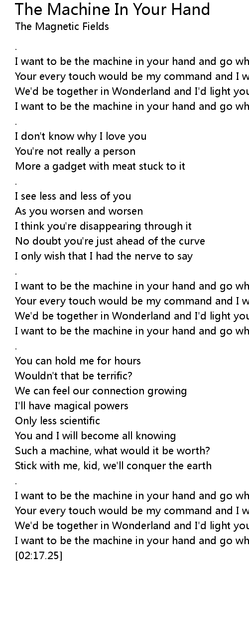 [02:11.31] I want to be the machine in your hand and go wherever you go