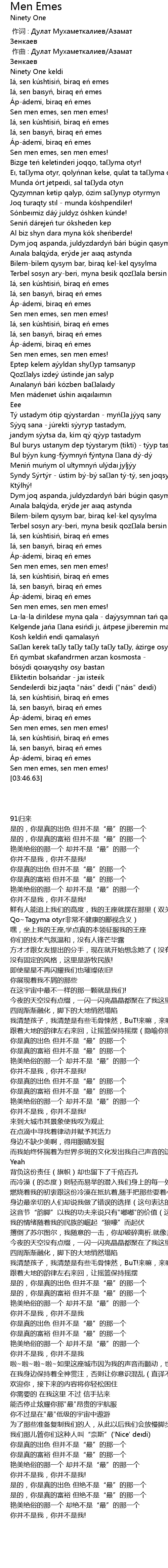 | [03:43.73] | Sen men emes, sen men emes! |